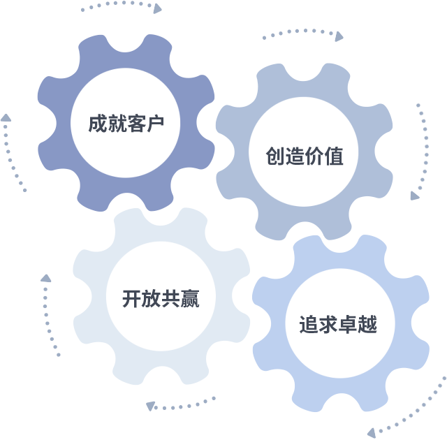 成就客户是一切决策的出发点,创造价值是衡量所有工作的标准,追求卓越是918博天堂做事做人的态度,开放共赢是918博天堂的格局也是最终的结果。价值观的齿轮环环相扣,推动着组织里的每个人不断向前。